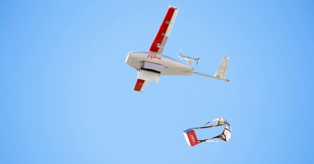 Zipline 的无人机通过降落伞投递货物