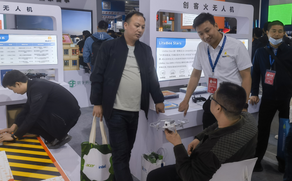 展会期间,创客火展位现场熙来攘往,小巧新奇、智能有趣的无人机及配套的课程、考证、白名单赛项吸引了众多教育界人士、老师和机构的兴趣。