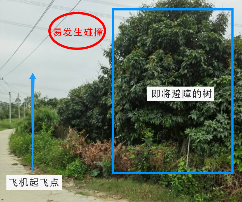 例1:无人机在左侧的位置起飞将要作业右侧的作物,无人机飞行到作物上仿树冠飞行爬高时会撞上电线,这类起飞点位置上面不能有电线。