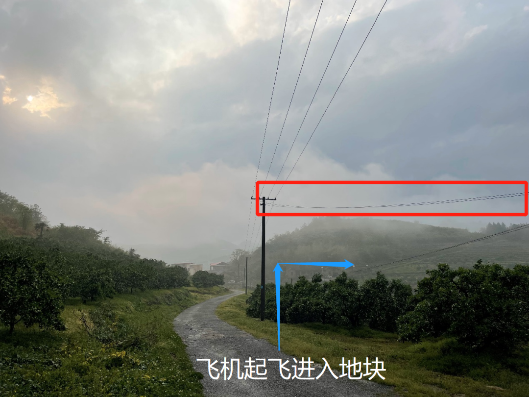 例2:无人机在进出地块时航线上方有电线,如果有更好的起飞位置,可以重新选择起飞点。