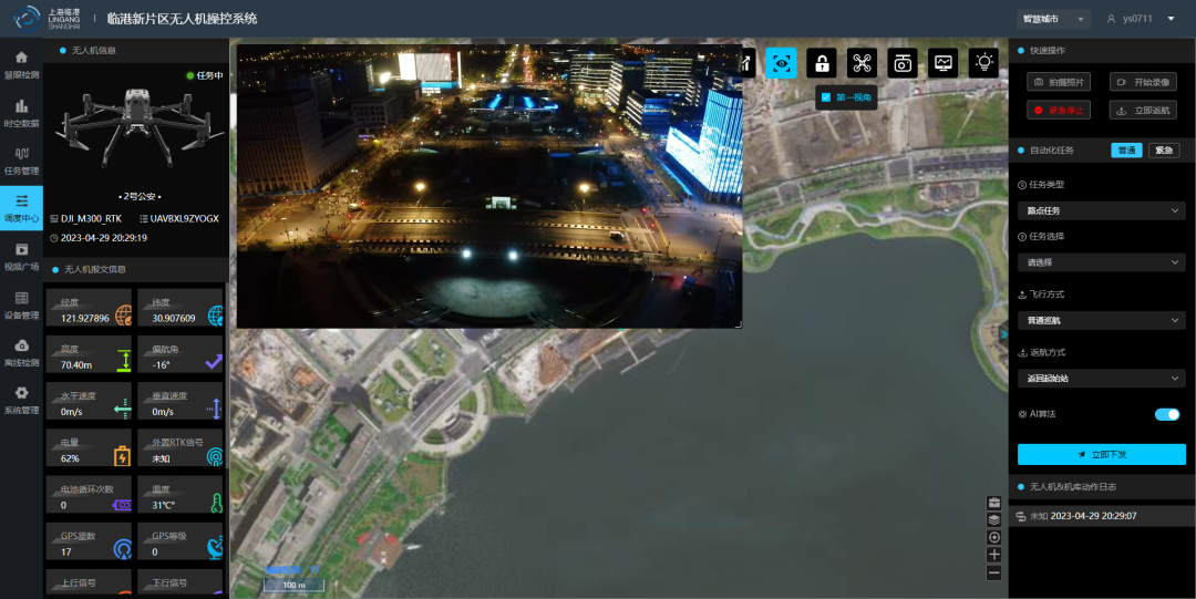 疫情后的全面开放意味着大客流的瞬时涌入,为应对城市中可能出现的多种情况,临港政府采用无人机机库+星逻万象的模式来进行日常巡逻,通过无人机机动灵活的巡检特色快速到达目标现场进行针对性巡检,弥补地面固定监控范围有限的问题。