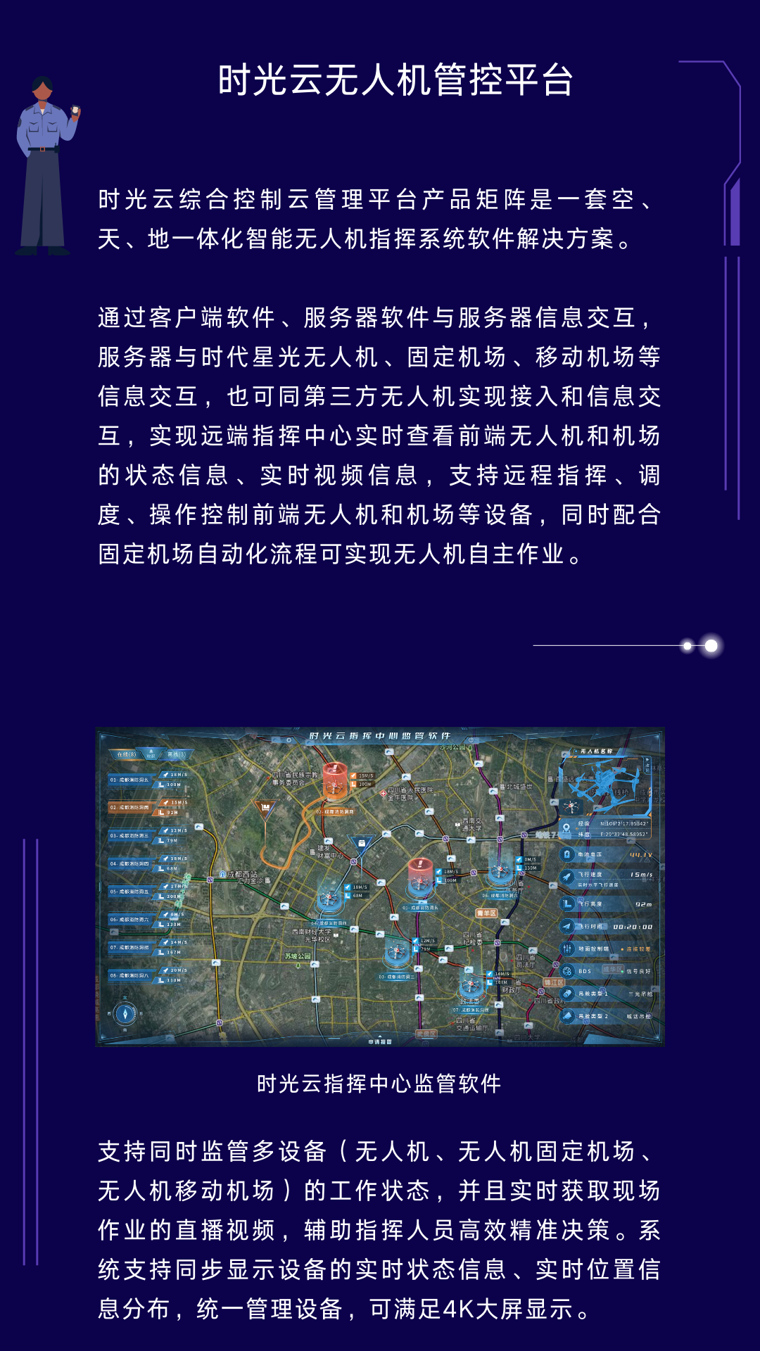 成都时代星光科技有限公司主营业务包括无线图像传输系统、卫星通信系统、智能无人机系统、通信指挥车及相关信息化集成业务。2004年-2006年主要生产数字电视设备如数字电视编解码器、调制解调器、数字机顶盒等产品;2006年-2014年主要生产多载波高速移动无线图像传输系统和卫星通信系统产品包括TFDM高清单兵图传、车载图传、机载图传、通信指挥车等产品,实现在高速移动的载体上实时传输高清图像和视频会议等功能。2015年开始大力投入工业级和军工级多旋翼无人机的研制工作,现已推出战狼X80、战狼X100、战狼X120、战狼X150、战狼X230、战狼XL200等从载重5公斤至25公斤级的多旋翼无人机及系留无人机系列产品。公司于2020年成功研制车载式智能无人机系统和空天地一体化AI指控系统等全球领先的高端技术产品,于2021年推向市场并于当年度中标两个千万级空地一体化无人机指挥车项目,此乃全球首套大型车载式智能无人机系统和空地一体化AI指控车项目,该系统实现了大载重工业无人机在行驶车辆上全自动起飞、降落、更换电池、充电、升降、回收、巡航、侦察遥感、运输抛投等功能,开创了国内全自动车载式智能无人机系统的技术空白。战狼无人机系列产品多年以来已经在公安、消防、武警、应急、军队等领域大量应用,实战经验丰富,品质过硬,能够在大风、大雨、高原、低温等较恶劣环境下执行任务,是安防和军工行业的首选。