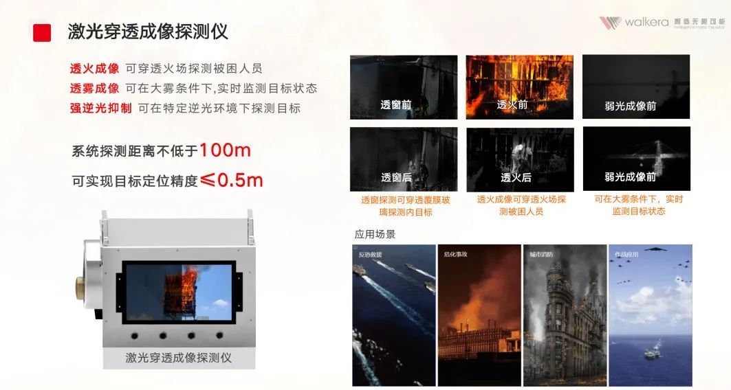 1.智能巡检平台硬件上搭载激光穿透成像探测仪,具备透火成像、透雾成像、强逆光抑制能力,在大火、烟雾和窗户玻璃阻挡等不利条件下,可在远距离观察起火单位中被困人员情况。