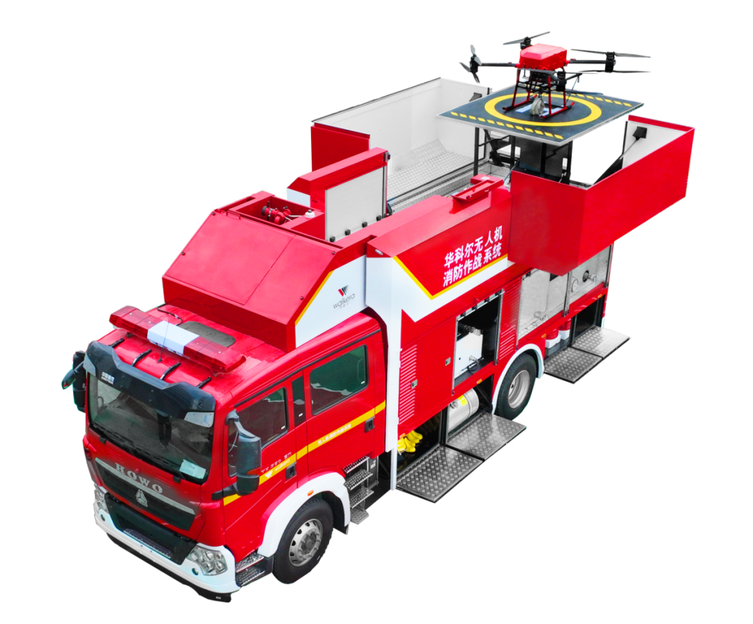 基于在消防无人机领域多年深耕和产业上下游布局的整合优势,华科尔在消防车+无人机两大垂直领域实现重大突破,推出新一代机车联动高层灭火救援系统,针对城市建筑消防场景打造移动式的消防作战系统,一台消防车搭载多台水带系留式消防灭火无人机,实现长时间不间断空中灭火,通过智能化作业精准解决高层建筑灭火痛点。