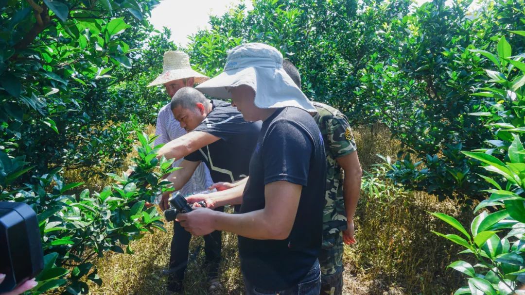 随后,技术人员在室外进行了飞防演示,向大家介绍了极目无人机的常温弥雾喷头和双目感知技术。在丘陵山地地形为主的地区飞防,极目无人机可以进行精准仿树型飞行,灵活避障,保证作业安全;可进行高效夜航作业,避免夏季高温时段。现场,技术人员带领学员们观察荧光剂喷洒效果,柑橘树下部以及内膛都均匀着药。