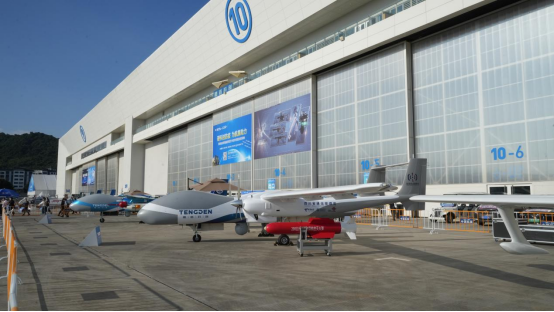 据介绍,本次展出的双尾蝎应急通信型无人机(缩比模型)是腾盾科创基于重大自然灾害中实现公众通信网络覆盖的迫切需求,在双尾蝎大型固定翼无人机平台基础上,为应急通信任务定制开发的专用无人机系统,也是全球首款全网应急通信无人机系统。该无人机翼展20米、机长10米、机高3.1米,独特的双尾撑、廿式气动布局使得该无人机具有更大的挂载空间与更强的挂载能力,机腹挂载全网通空中基站,机翼仍有多个挂点可拓展空中基站或挂载其他应急投送、应急测绘等任务载荷,这将极大丰富应急通信型无人机的使用场景与作业范围。双尾蝎应急通信型也是目前应急通信领域唯一配置了两台发动机和两台发电机的无人机系统,这使得无人机在可靠性、安全性、留空时间、作业空间、供电能力,以及复杂地理环境、复杂气象条件下的适应能力和部署能力等方面具有显著优势,上述这些特点也使得这款无人机特别适用于应急通信领域。