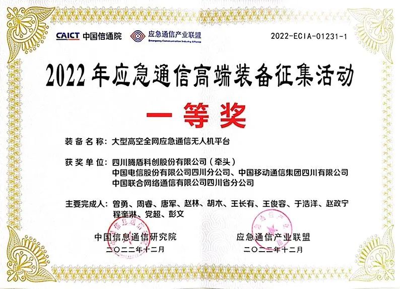 11月,腾盾“大型高空全网应急通信无人机平台”项目荣获由工业和信息化部信息通信管理局组织的2022年应急通信高端装备征集活动一等奖。