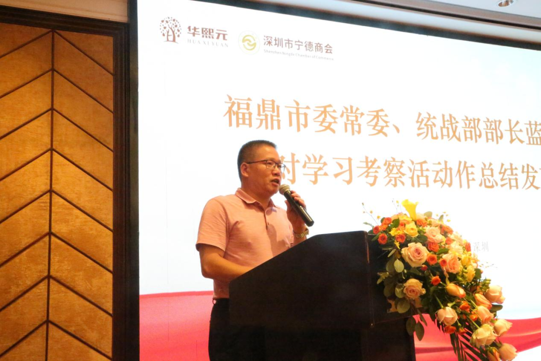 福鼎市委常委、统战部部长蓝承忠发言中指出,深圳是改革开放的前沿阵地,是粤港澳大湾区的先行示范区,近日对深圳优秀企业走访参观收获良多,深圳的城市发展经验、企业管理有很多值得学习、借鉴的地方。邀请在座领导、企业家有机会前往“中国白茶之乡”、“中国美食之乡”福鼎走访考察、传经送宝。对深圳市宁德商会和华熙元集团对于本次学习考察行程给予支持帮助表示了诚挚感谢。