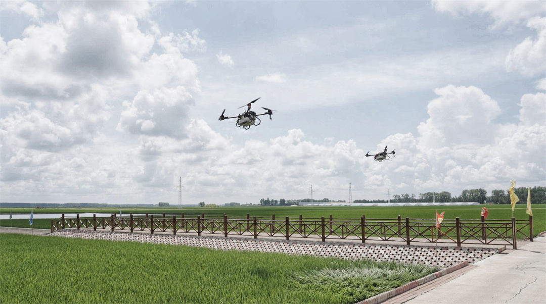 炎炎夏日里,黑龙江北大荒的千里沃野上,各种农作物正在茁壮成长,一片欣欣向荣的景象。一台台无人机从田间地头腾空而起,向着农田飞去,如检阅士兵一般喷洒着液态肥。