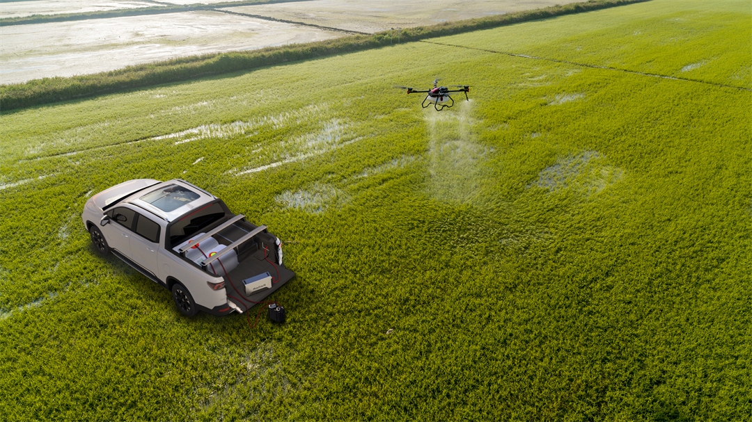 但充电困扰也随之而来。如果使用燃油皮卡、以发电机为无人机供电,不仅成本高,噪音大,污染也不小。相比之下,自带“充电宝”属性的纯电皮卡雷达RD6就可以非常契合植保无人机的使用场景。