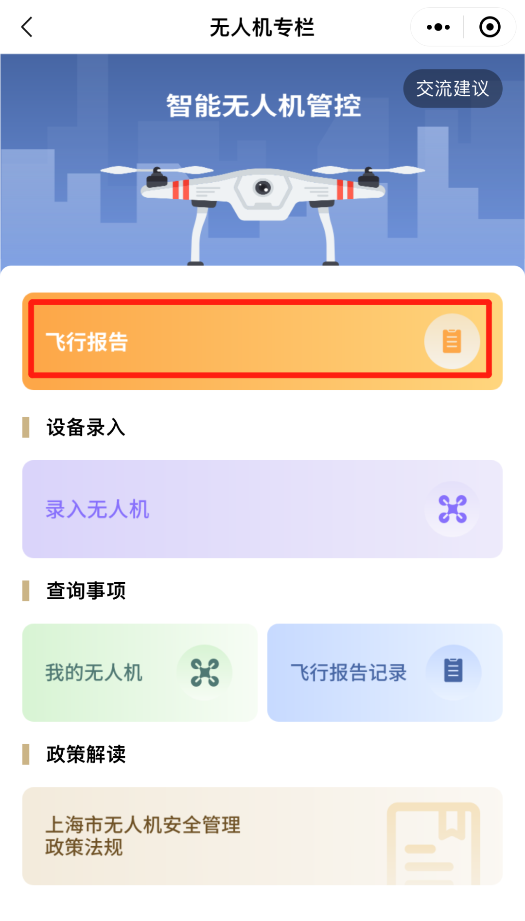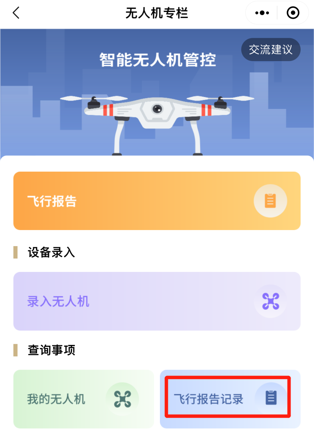 完成无人机的录入后,在飞行前可点击飞行报告进行报备。
