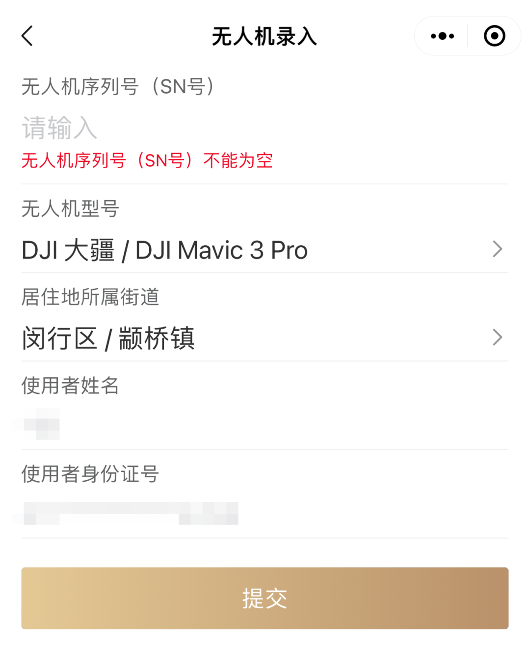输入使用者的无人机序列号(SN号)、使用者姓名、使用者身份证号,选择无人机型号及居住地所属街道,点击提交。