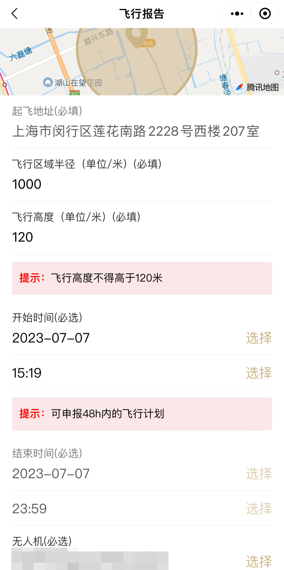 选择起飞地址、飞行区域半径(单位/米)、飞行高度(单位/米)、开始时间、结束时间、无人机,选择好后进行提交;如涉及到管控区域则无法提交。