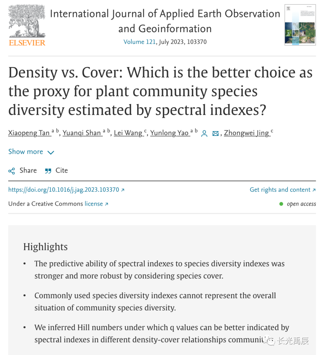 [1] 论文信息:Tan, X., Shan, Y., Wang, L., Yao, Y., Jing, Z., 2023. Density vs. Cover: Which is the better choice as the proxy for plant community species diversity estimated by spectral indexes? International Journal of Applied Earth Observation and Geoinformation 121, 103370. doi: https://doi.org/10.1016/j.jag.2023.103370.