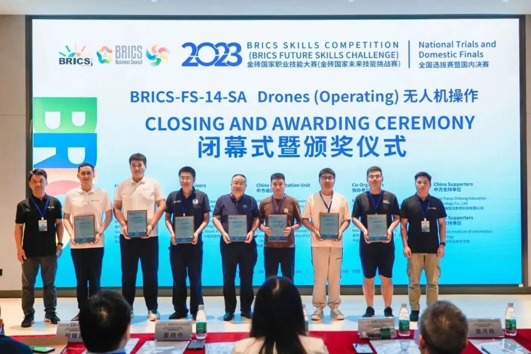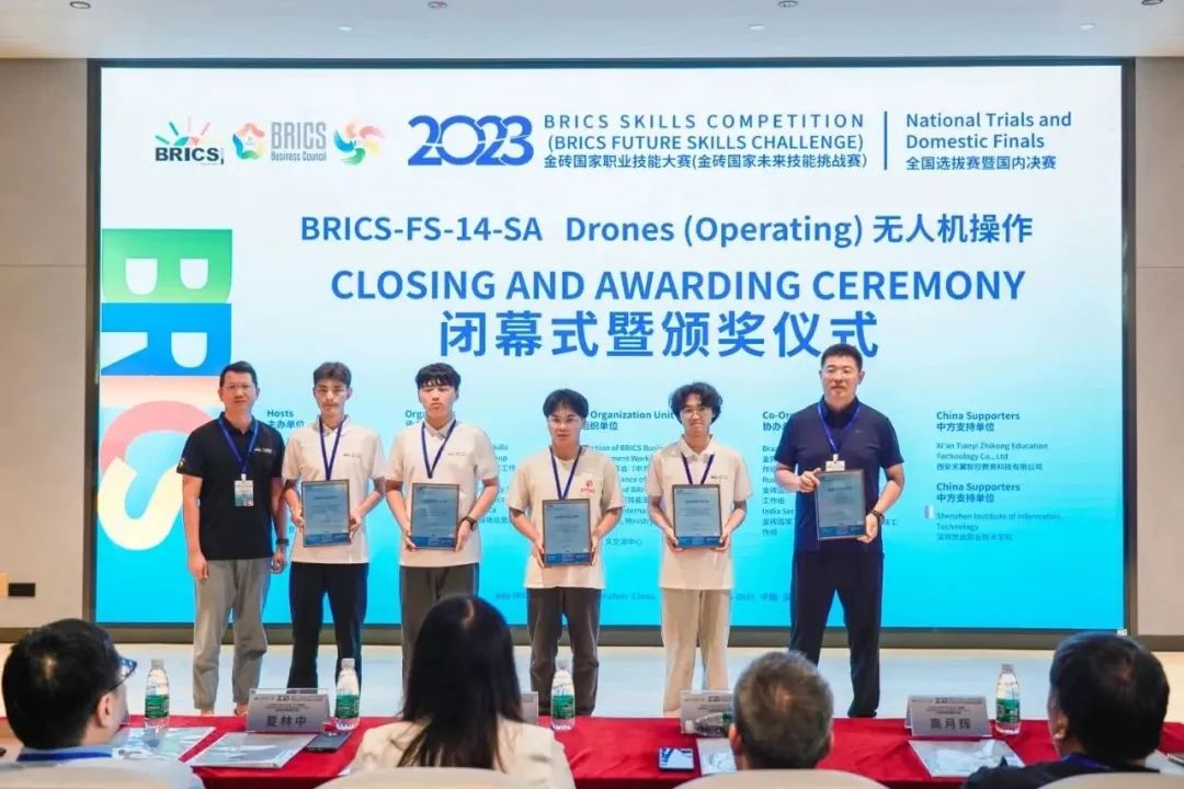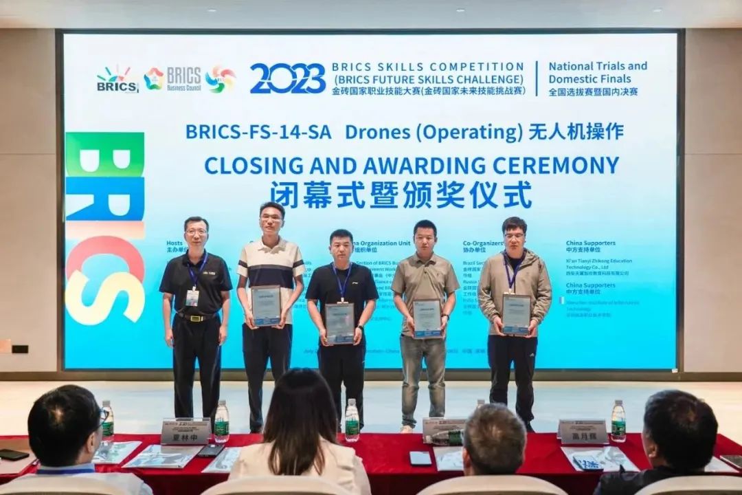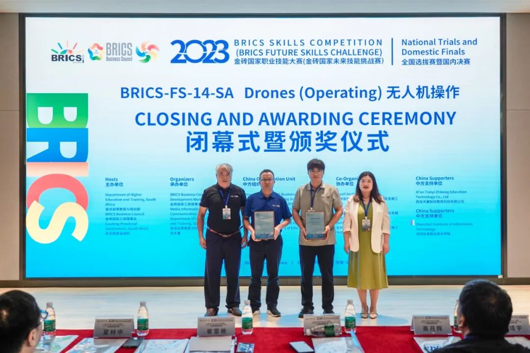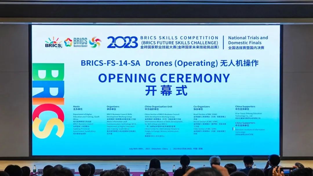 ‘2023金砖国家职业技能大赛无人机操作赛项全国选拔赛暨国内决赛’由南非高等教育与培训部、金砖国家工商理事会、南非豪登省政府主办,金砖国家工商理事会 (中方) 技能发展工作组、一带一路暨金砖国家技能发展国际联盟、教育部中外人文交流中心组织,本场比赛由深圳信息职业技术学院承办,西安天翼智控教育科技有限公司提供技术支持。
