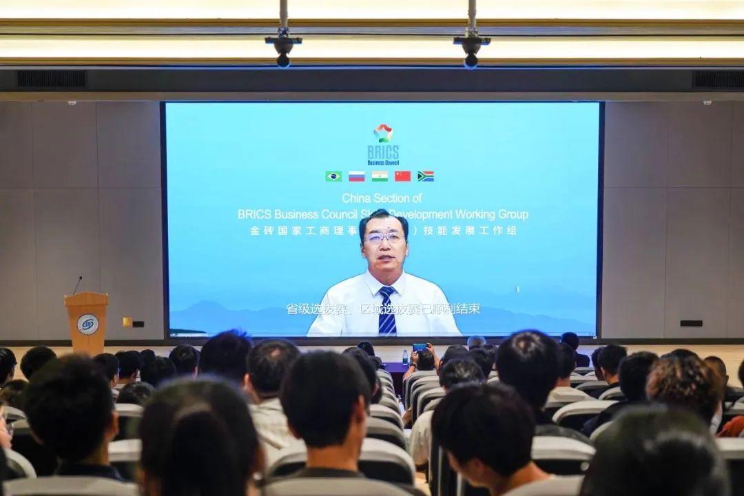 开幕式上播放金砖国家工商理事会技能发展工作组主席Mapule Ncanywa (马普勒·恩坎瓦)女士来自南非的祝福视频、金砖国家工商理事会(中方)技能发展工作组组长刘振英(博士)的致辞视频;深圳信息职业技术学院王晖校长上台致辞,预祝参赛选手赛出风格、赛出水平!