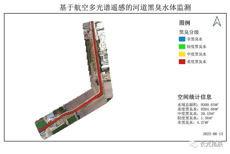 黑臭水体是指水质污染严重、水体颜色异常、散发恶臭的情况。它通常由生活污水、工业废水和农业排放物等引起,造成环境破坏和健康风险。通过无人机多光谱遥感技术,结合水色与实测水质参数数据的分析,对本次实验河道黑臭水污染的识别情况如图5所示。