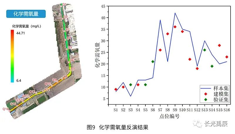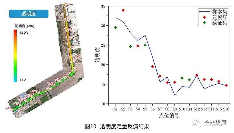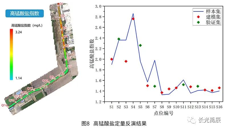 精度评定结果见表2,各水质参数的平均相对误差均在25%以下,可满足常态化、高频次的全局水质检测需求。化学需氧量反演误差稍大是因为该条河道整体水质情况存在较大的空间异质性,河道不同河段中有机物含量差异较大,而水体化学需氧量与有机物浓度密切相关,所以这种变化较快的梯度可能会引入一定的误差,模型也有继续优化的空间。