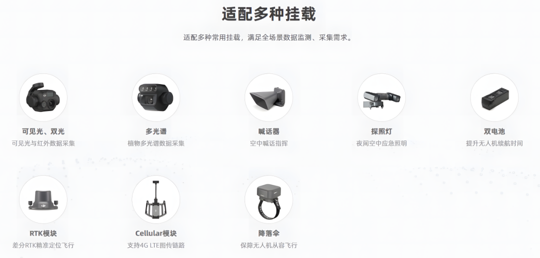 智方 S20 还具有丰富的挂载适配性,丰富挂载可适应多种场景的作业需求。支持空中喊话指挥,还是夜间应急照明等,具备高度能力适应。