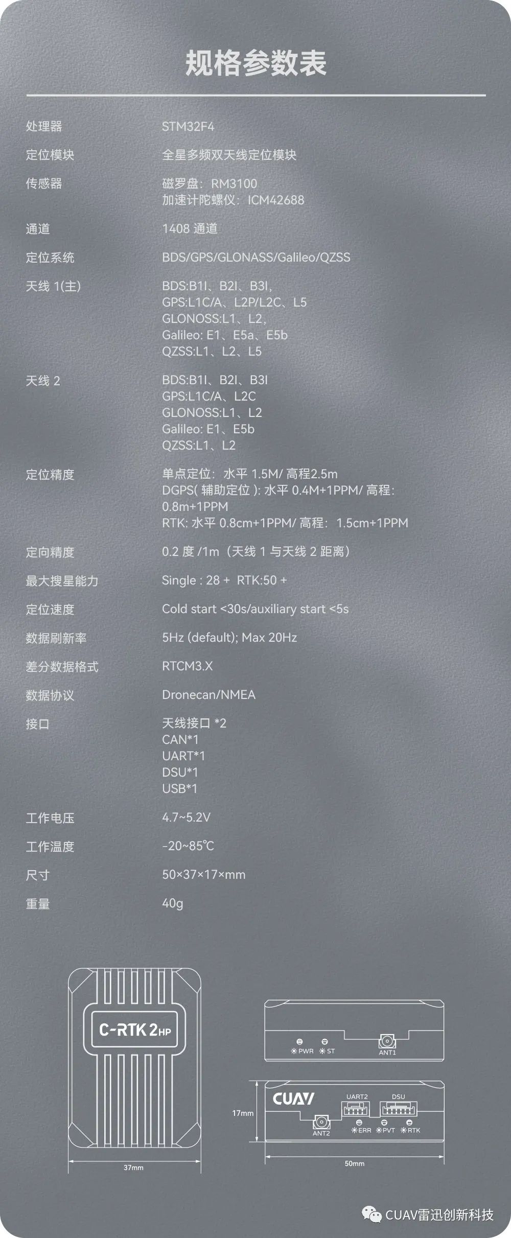 C-RTK 2hp支持一个模块,双天线接收,实现无人机测向,取代磁罗盘,以更低的成本,实现更稳定的飞行,适应复杂环境