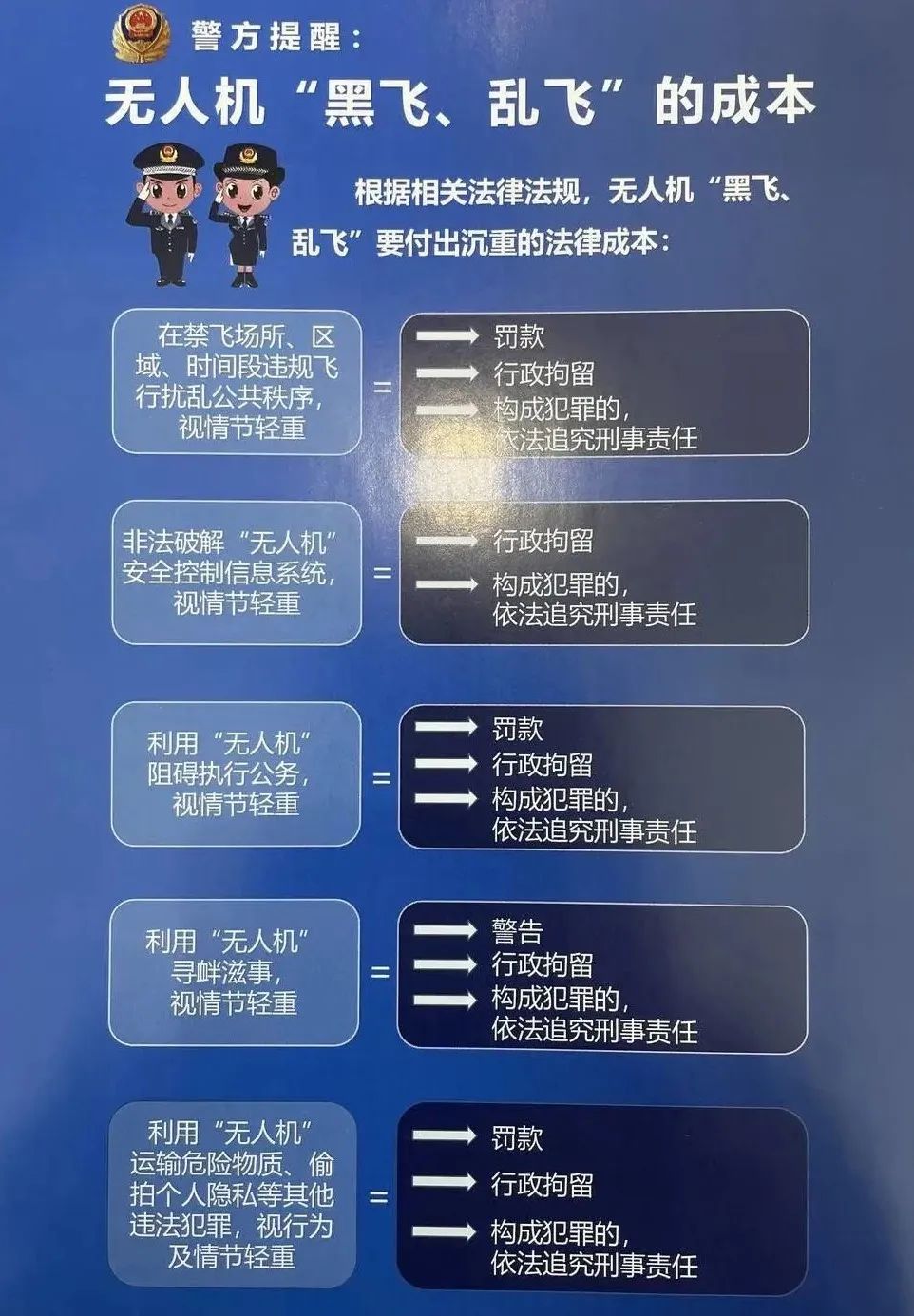 关注「帆陌飞保」 了解最新无人机行业动态 黑飞 安全飞行/拒绝黑飞 怕炸机,找帆陌 最近,青岛、威海、成都等地先后发布加强对 “低慢小”航空器飞行管控的通告。 有飞友就在群里开始讨论了,万一管控期间不知道禁飞的消息,飞了无人机怎么办? 请注意,这就属于“黑飞”了哦! “黑飞”是什么 在不能飞无人机的地方,比如在公园、景区、广场等人员密集的地方飞无人机,或者并不具备无人机的操作资质飞无人机,那这些情况就属于“黑飞”。 层出不穷的黑飞 万州:净空区域黑飞受罚 经查,当事人系万州某传媒公司员工,在未报备的情况下,利用非法破解的无人机从事商业拍摄活动。 成都:顶风黑飞,警方查处 什么情况下叫黑飞? 无人机未实名登记 根据我国民航局相关规定,无人机起飞重量超过 250 克(含),需进行实名登记注册。 以大疆系列产品为例,除 DJI Mini 系列外,均需进行实名登记。 没有飞行资质 常用的无人机证件有四种: CAAC《民用无人机操控员执照》,由中国民航局飞行标准司颁发,持证者凭执照有申请空域审批和申报航线的合法权利。 AOPA《民用无人驾驶航空器系统合格证》 ,与CAAC学习内容一致,可在获得CAAC执照后同步申请。 UTC是大疆自己开设的培训机构,针对无人机航拍、无人机农业植保所开展的无人机技能培训。 ASFC《遥控模型航空器飞行员执照》,该证一般只针对于有竞赛需求的无人机用户。 针对特定类型的无人机,持证飞行才能合法合规,同时还能解锁如空域申请、航线申请等更多操作权限。 禁飞空域飞无人机 在哪查询禁飞区? 1、民航局或当地公安机关网站上查询无人机飞行管制信息; 2、大疆官网。进入官网,选择【服务与支持】-【更多服务】-【安全飞行指引】; 无人机新规这么规定的 在新规中,明确了使用单位和操控人员从事飞行活动的资质要求以及飞行空域的管控划分机制。 飞手资质 微型、轻型无人机不需要任何操控员执照,小型、中型、大型无人机需要飞手拥有相应的飞行资质。 飞行空域 在飞行空域方面,高度高于120米的所有空域,以及管理机构规定的禁飞区都为飞行管制区域。 除管控空域外,无特殊情况均划设为微型、轻型、小型无人无人机的适飞空域。 无人机责任险 新规中除了明确了飞行资质和飞行空域,还对无人机责任险做出明确要求。 使用无人机从事商业飞行活动,以及使用小型、中型、大型无人机从事非经营性飞行活动,都应当依法投保责任保险。 如果使用无人机从事商业活动却不配备无人机保险的话,也将会受到相关部门的处罚。 为什么不能黑飞? 根据相关法律法规,无人机“黑飞”要付出沉重的法律成本,轻则罚款拘留,构成犯罪的,将依法追究刑事责任。 无人机飞行,安全不容忽视 无人机保险作为转移风险的产品,就是在无人机发生炸机事故时来转移用户的风险和经济损失。 帆陌飞保,是国内首个无人机综合商业保险,也是行业内唯一持续运营时间超过八年的无人机保险产品。 无人机发生事故时造成的经济损失,比如无人机的维修费用和第三方的人身财产损失费用,都可以由帆陌飞保来承担。 帆陌飞保,无人机保险产品推出至今,已为全国31省市超过3万名无人机用户和8000家企事业单位提供无人保险支持与服务。