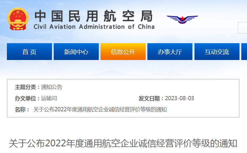 ■ 8月3日,民航局公布2022年度通用航空企业诚信经营评价等级结果。此次评价周期为2022年1月1日-12月31日,评价对象包括2022年内开展经营作业的传统通用航空企业...