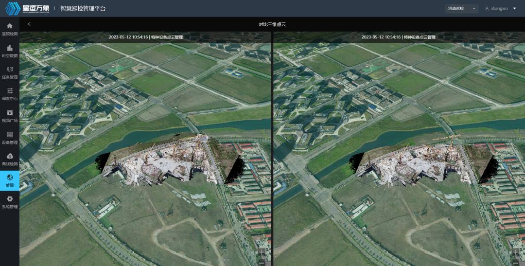 而基于无人机对目标对象扫描生成的三维模型和二维正射图,用户可通过“卷帘模式”对采集的数据进行时空对比分析。在智慧工地项目巡检中,用户可利用无人机采集不同时段的工地二维与三维数据,由此可对项目的进度更新变化进行清晰比对,方便用户知悉施工成效。