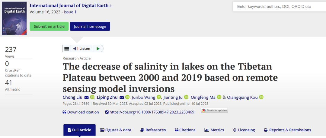 近日,航天宏图信息技术股份有限公司在站博士后研究成果以“The decrease of salinity in lakes on the Tibetan Plateau between 2000 and 2019 based on remote sensing model inversions”为题,发表在《International Journal of Digital Earth》,该期刊由国际数字地球学会主办,在最新中国科学院SCI期刊分区中被评估为最高级别1区Top期刊,是遥感与数字地球领域国际权威期刊。航天宏图公司与中国科学院青藏高原研究所联合招收博士后刘博士为论文第一作者及共同通讯作者。