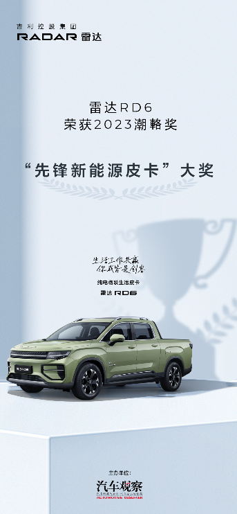 此外,在车展开幕当天,雷达RD6荣获2023潮輅奖“先锋新能源皮卡”大奖。据悉,潮輅奖由中国国际贸易促进委员会汽车行业分会指导,汽车观察主办,雷达RD6作为国内首个原生纯电皮卡,基于国内首个原生纯电皮卡平台M.A.P平台的核心优势,以其出色的纯电性能、智能物联、乘用化设计等亮点,极大拓展了户外生活的更多可能,并为户外商业生产经营等提供一站式解决方案,展现了出色的行业影响力。