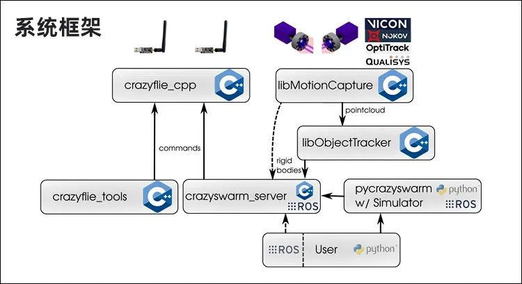 软件组成由一系列ROS包和Python脚本组成,实现了无人机的控制、仿真和数据分析等功能。提供PythonAPI/ROS/Matlab接口,方便开发者进行编队功能开发。
