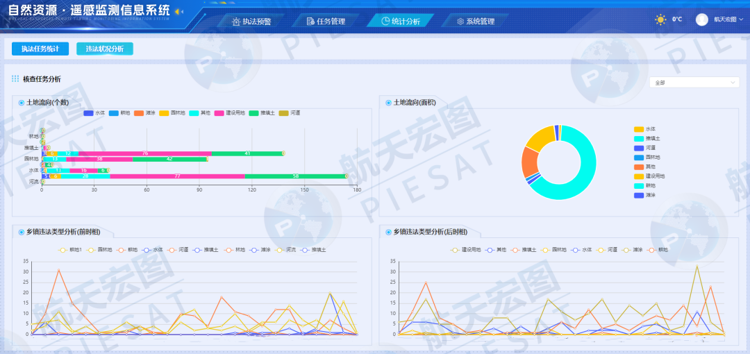 用于对自然资源违法情况等进行总体统计和分析,支持任务完成度统计、任务进度统计、土地流向分析、违法类型分析等,便于管理人员及时查看,掌握总体情况。