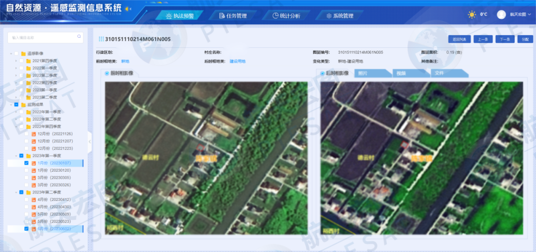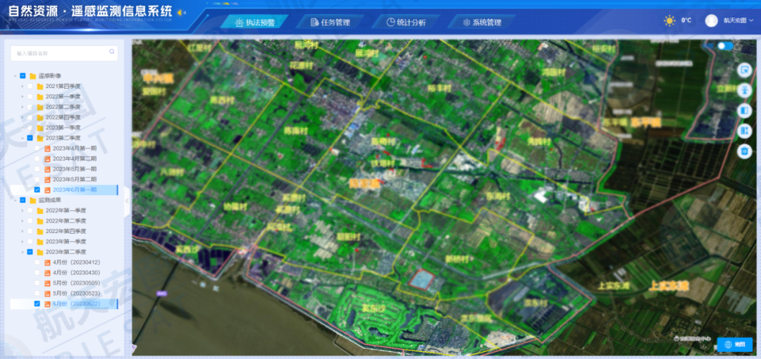 利用亚米级遥感卫星影像数据,按照半月度频率,每隔15天采集一期全域卫星影像,为自然资源动态监测提供“一手”数据来源,及时反映自然资源变化情况。融合业务数据(耕地范围数据等)和区镇村三级区划数据,在影像地图上直观查看现实变化状况和数据归属。