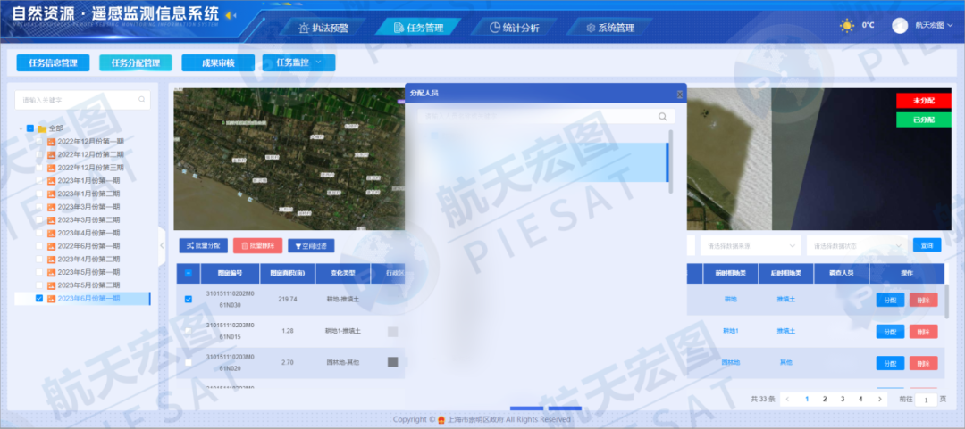 对任务进行分配,勾选一期核查图斑后,可以点击分配按钮,选择对应的网格负责人点击确定,该核查图斑就会分配成功。