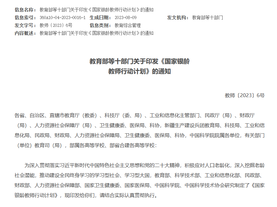 日前,教育部等十部门联合印发《国家银龄教师行动计划》(以下简称《计划》),搭建国家层面老有所为平台,挖潜退休教师资源优势,发挥其有益补充、示范引领作用,推动建设全民终身学习的学习型社会、学习型大国,加快建设教育强国。