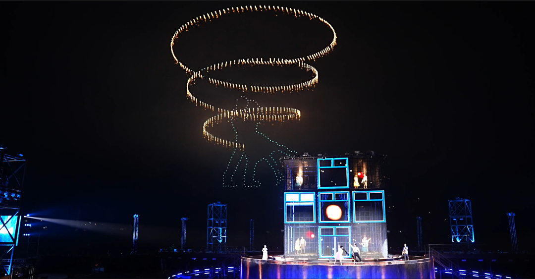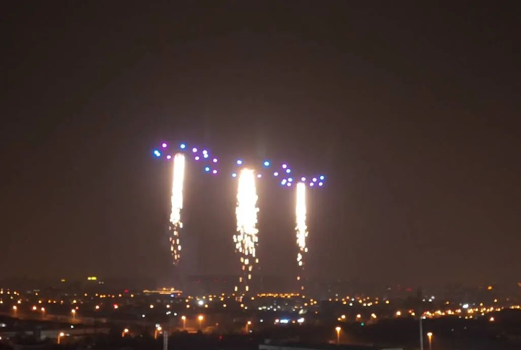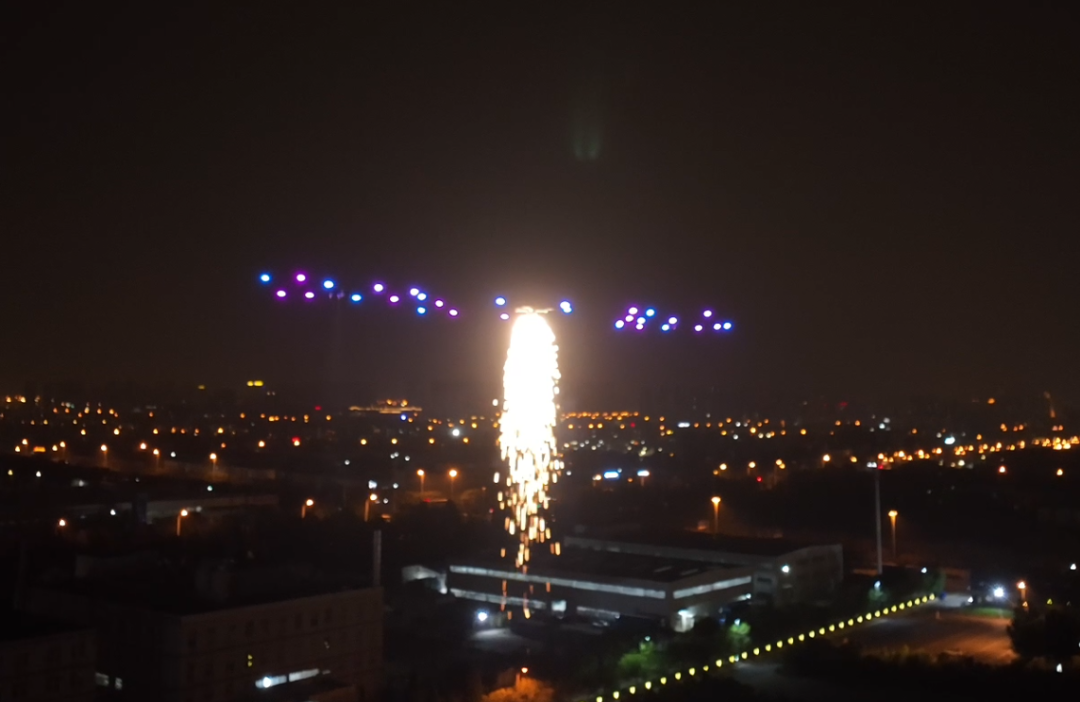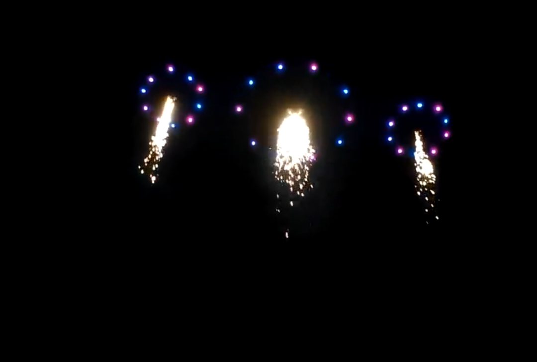 *视频中无人机组成3个同心圆,左右圆中心为M600无人机搭载4颗烟花,中间圆中心为N10搭载20颗烟花。同心圆外圈均为敏捷蜂III型无人机。