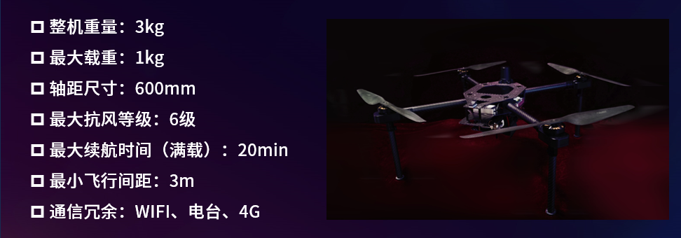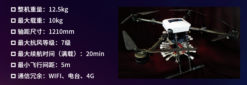 载重型室外系列无人机最小载重量1kg,最大载重量10kg,充分满足不同场景、不同载重需求。