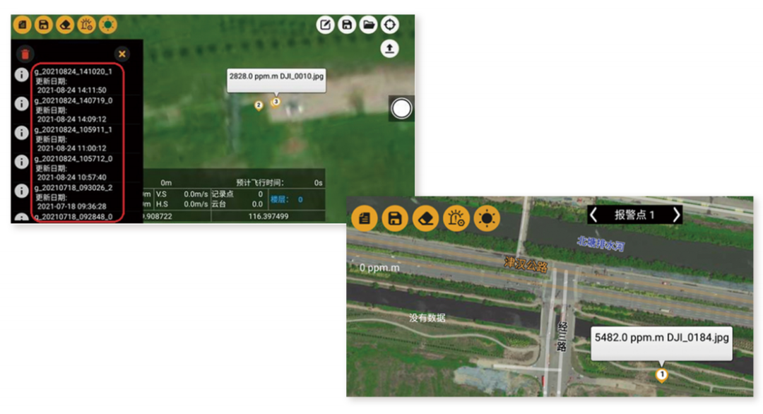 历史巡检报告,根据日期排序。打开巡检报告,所有报警点依据经纬度坐标显示在地图界面上。点击某一报警点,显示出浓度值和自动拍摄的照片编号,根据这些信息可以对报警点进一步核查。