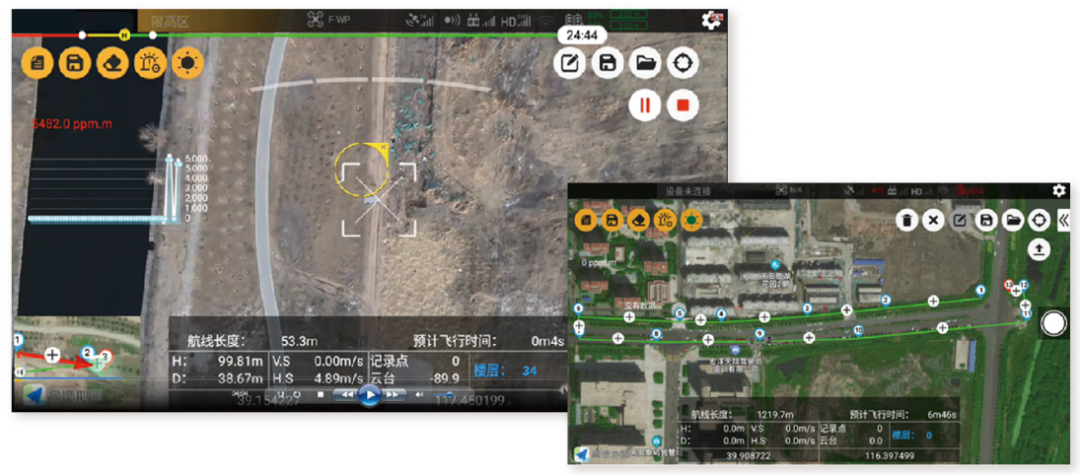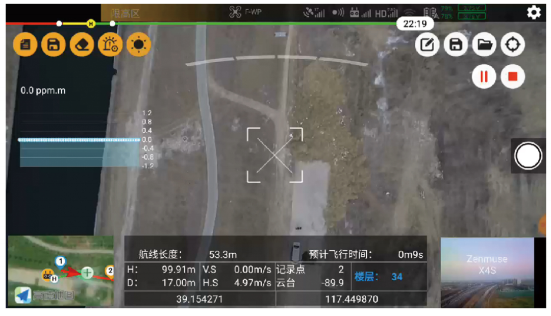 巡检软件APP安装在遥控器上。飞行界面包括图像界面和地图界面,可以点击切换。飞行界面左上角显示实时甲烷浓度和历史波形,下方显示飞行数据。航线编辑界面可以编辑、修改航线,航线上传后无人机可以进行自动飞行巡检。检测到超过阈值的甲烷泄漏,无人机会自动拍照,并记录浓度值和位置经纬度坐标。