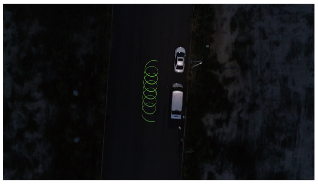 无人机摄像机拍摄的对地画面,可以看到激光在地面上画出的螺线轨迹和投影宽度。