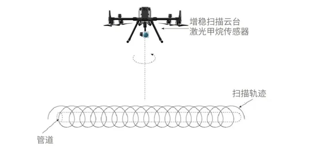 无人机沿管线上方飞行,增稳云台保持激光照射方向垂直对地,扫描控制器控制云台转动,激光照射在地面的投影呈螺线形状,扫过一定宽度(约3~5M)。