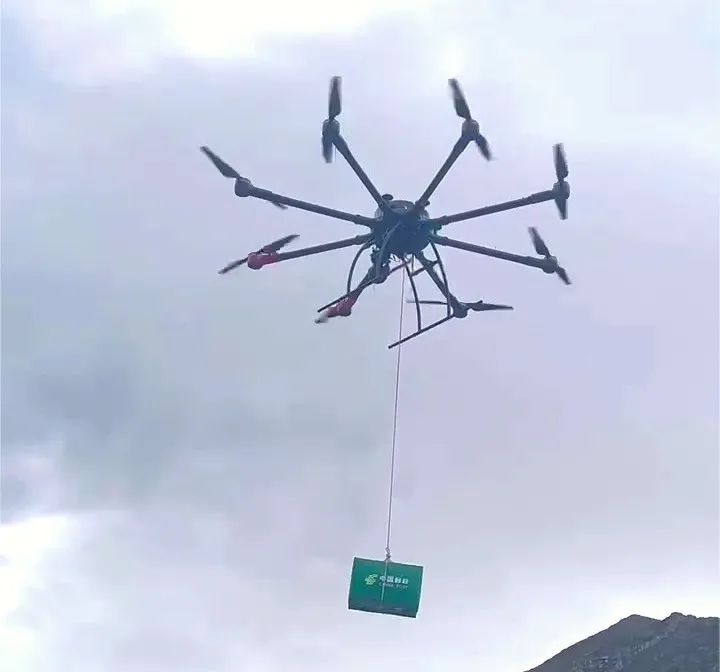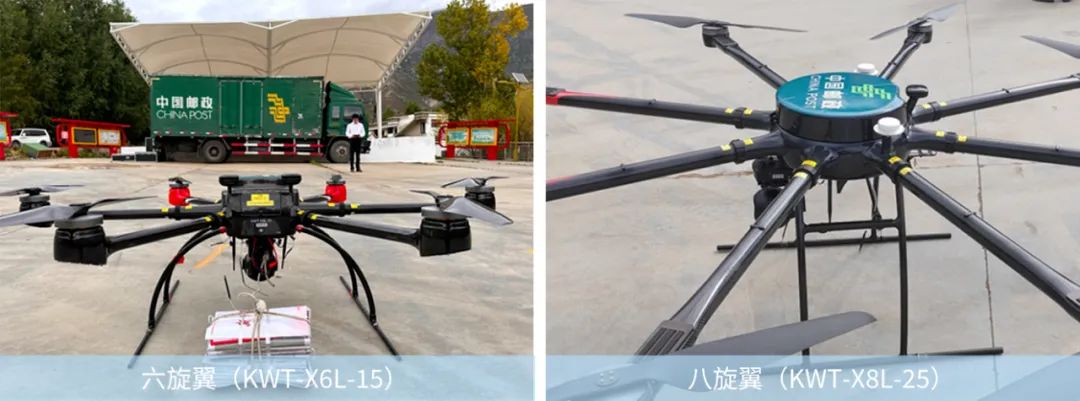 西藏邮政操作飞手杜鹏介绍,为适应高原多变的气候环境,西藏邮政无人机运输团队编有多旋翼、复合翼、纵列双旋翼等机型,目前主力机型为六旋翼(KWT-X6L-15)和八旋翼(KWT-X8L-25)两款机型,飞行速度可达10米/秒,平均载重10-15KG,最大航程15KM,抗风能力优越,在高原飞行表现出色,特别是在高原高山密林地区尤为适合。