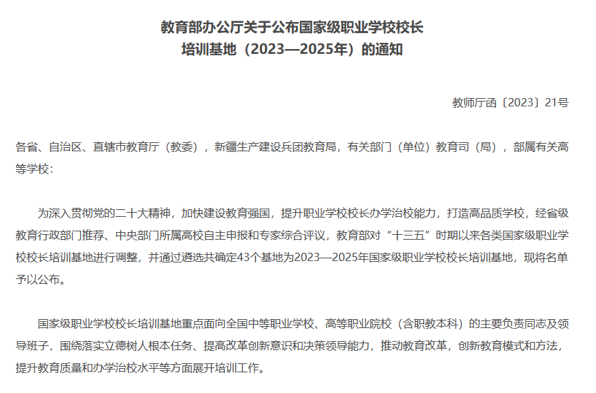 教育部办公厅关于公布国家级职业学校校长培训基地(2023—2025年)的通知