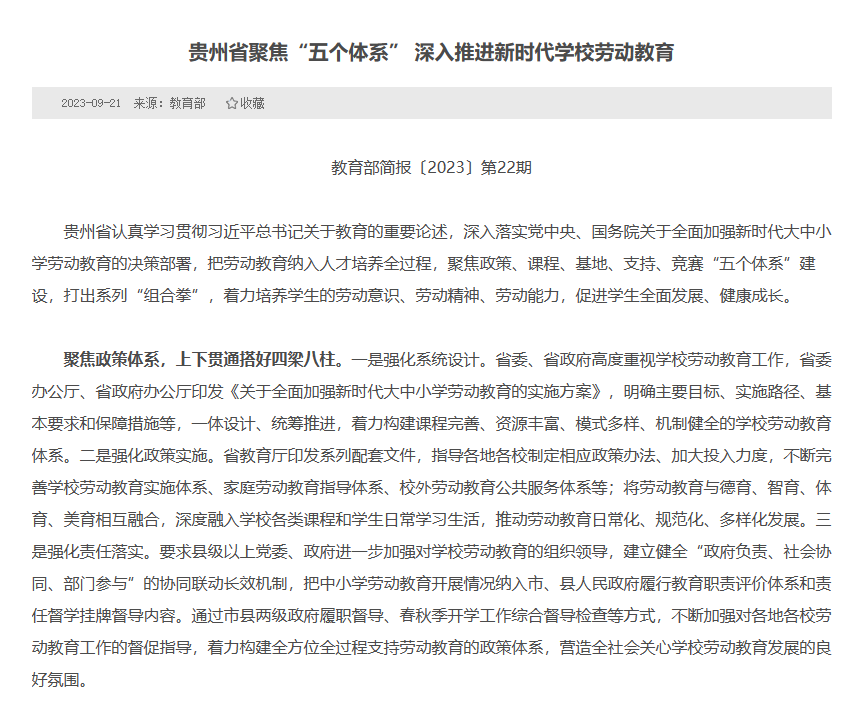 贵州省认真学习贯彻习近平总书记关于教育的重要论述,深入落实党中央、国务院关于全面加强新时代大中小学劳动教育的决策部署,把劳动教育纳入人才培养全过程,聚焦政策、课程、基地、支持、竞赛“五个体系”建设,打出系列“组合拳”,着力培养学生的劳动意识、劳动精神、劳动能力,促进学生全面发展、健康成长。
