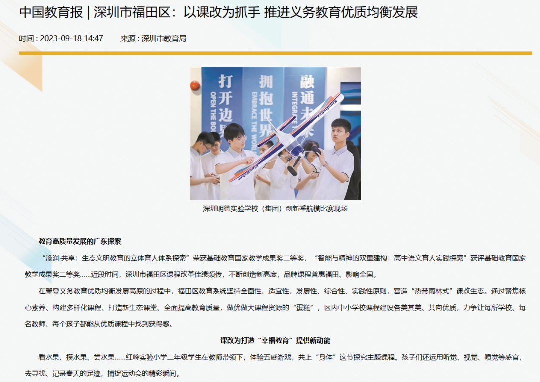 深圳市福田区:以课改为抓手 推进义务教育优质均衡发展