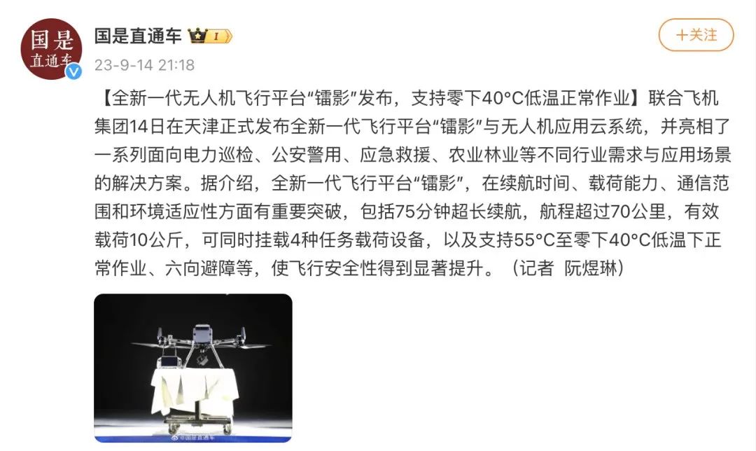 【全新一代无人机飞行平台“镭影”发布,支持零下40°C低温正常作业】联合飞机集团14日在天津正式发布全新一代飞行平台“镭影”与无人机应用云系统,并亮相了一系列面向电力巡检、公安警用、应急救援、农业林业等不同行业需求与应用场景的解决方案。