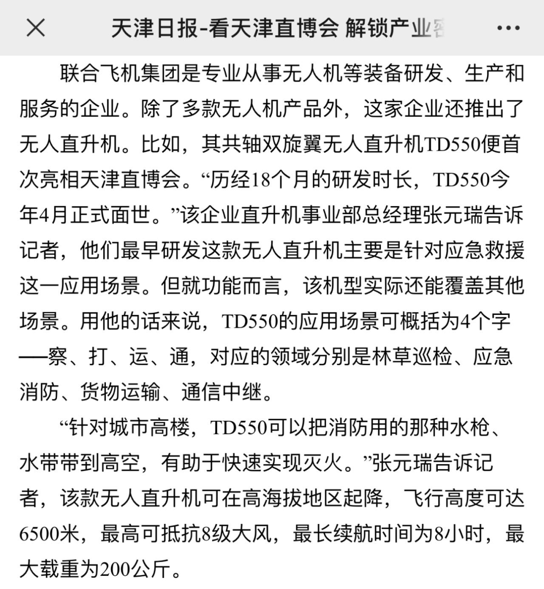 联合飞机集团直升机事业部总经理张元瑞表示,TD550比较核心的关键零部件以及核心的关键技术都是完全自主研发的。因为TD550是共轴无人直升机,所以它的机身尺寸小,抗侧风能力非常强。