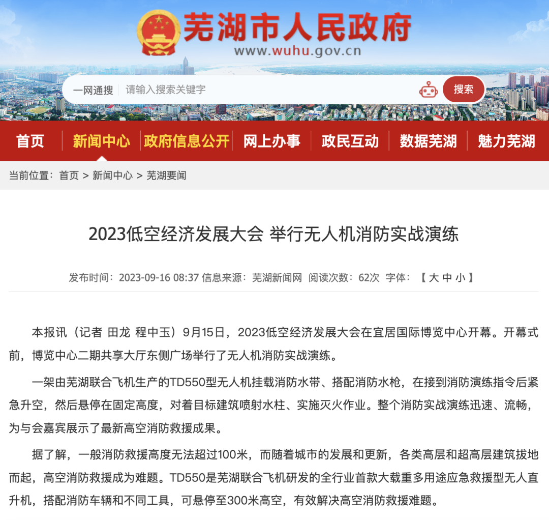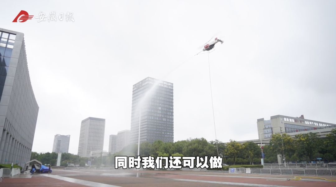 “对于城市高层建筑消防来说,无人机的配合能有效解决消防车进不去、云梯够不着等问题,实现空地一体化高效灭火。”芜湖联合飞机科技有限公司总经理闫怀强说,在加满油的状态下,TD550携带消防水带可升高到150米,飞行时间可持续8个小时。