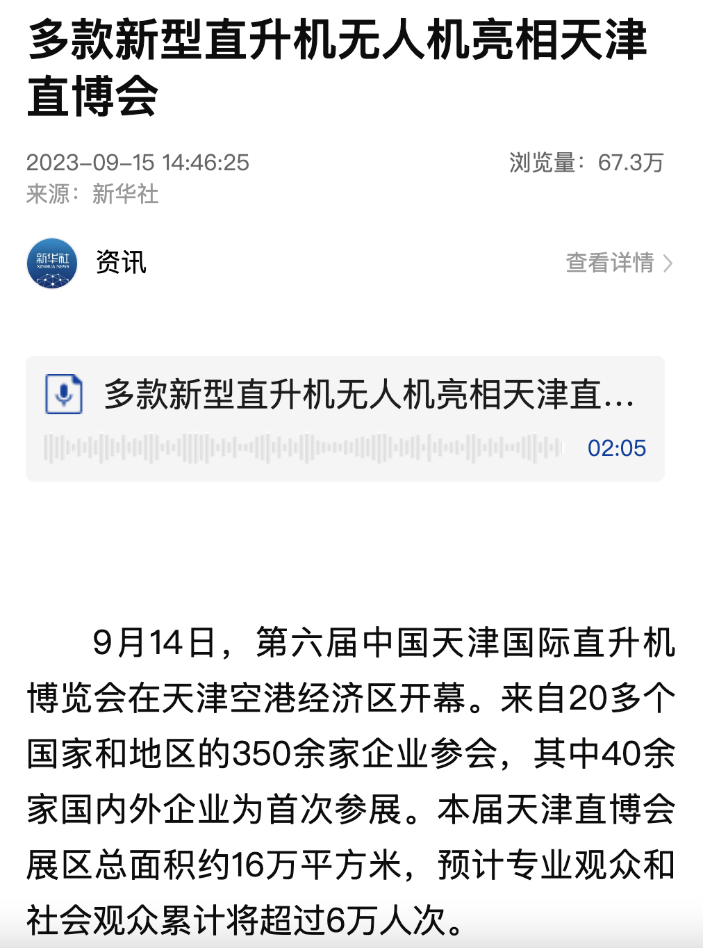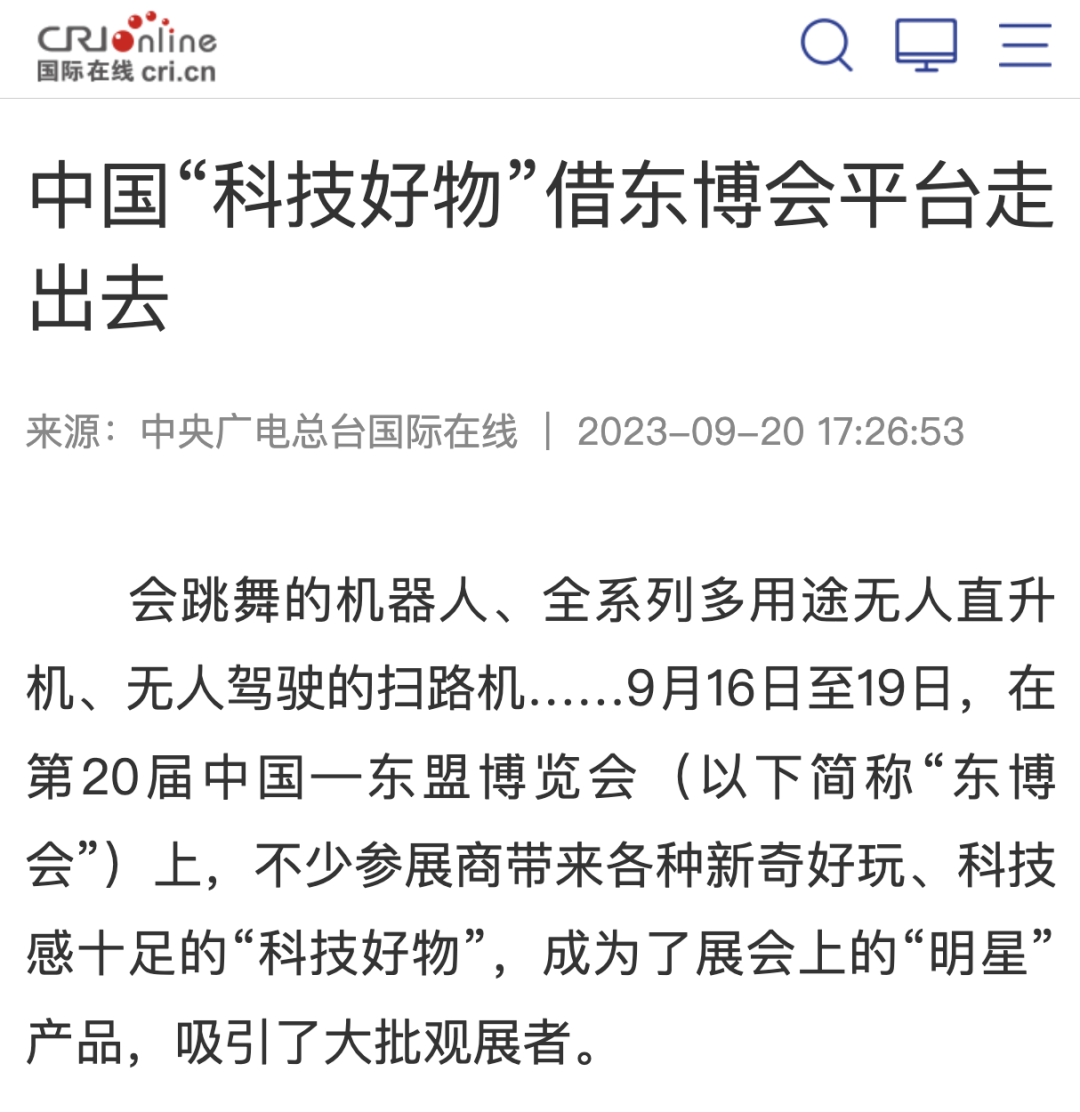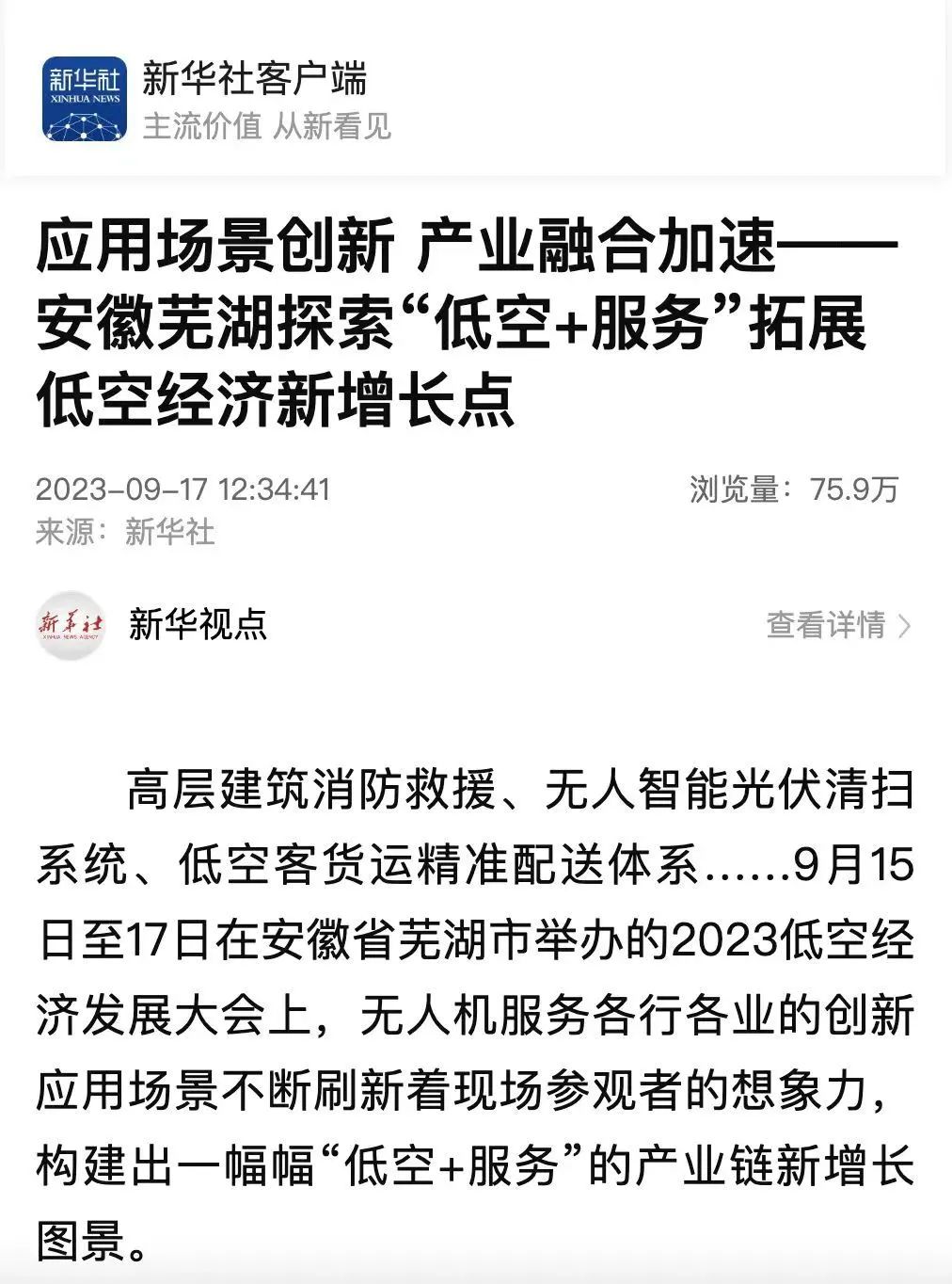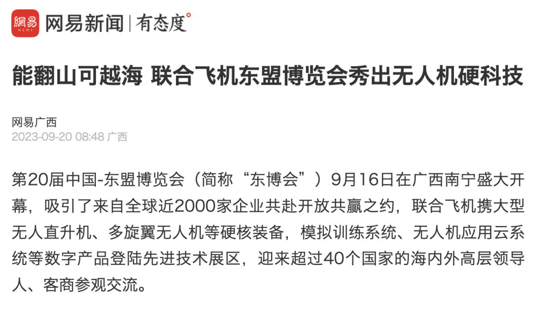 “制造”新潮流,无人新时代。9月14-19日,中航智(母公司联合飞机集团)在天津、安徽、广西三地同时亮相,镭影Q20三省齐发,高精尖装备齐亮相,系列场景解决方案落地应用,为直博会、低空经济发展大会、中国-东盟博览会带来了新景象,接连获得国内外70+主流媒体平台的高质量报道和超强覆盖传播,展现了中航智的科技力量,诠释了智能无人机的新价值。