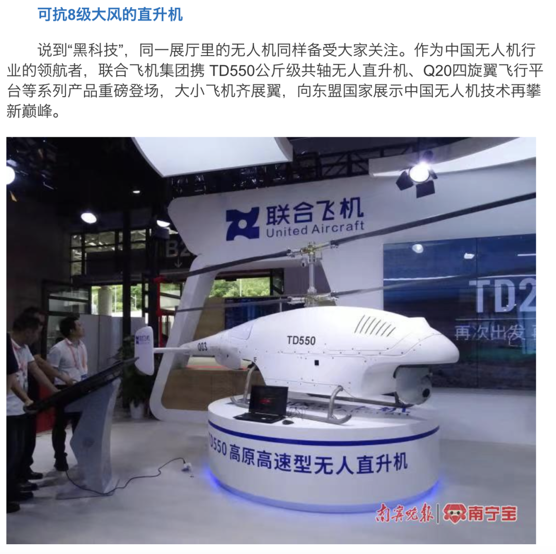 “我们带来的TD550无人直升机具备多余度控制、快速飞行、强抗风能力等特点,最大起飞重量为550公斤级,最大升限达到6500米,最长续航时间为8小时,空中抗风8级,可以应用在应急消防、林草巡检、运输投送、农林植保等领域。”联合飞机总裁助理兼集团市场总监孙立业表示,希望此次展出,能让广西各级政府和广大客户了解中国的无人机产品,同时向东盟国家展示中国无人机的先进技术,让中国的无人机产品更好地走出去。