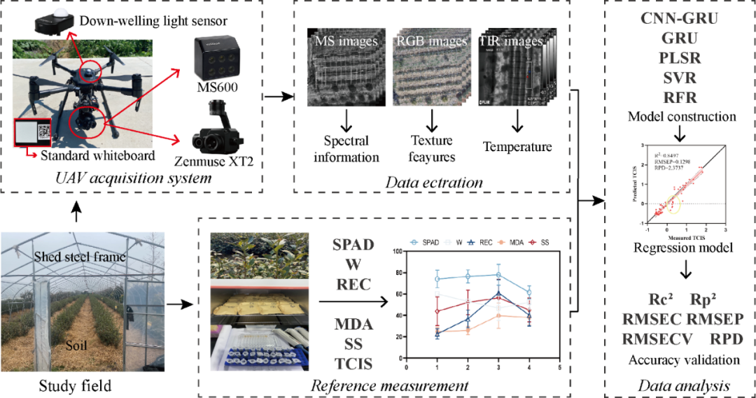 在这项研究中,作者利用无人机搭载多光谱(MS600 Pro)、热红外(TIR)和RGB等传感器采集自然越冬茶园不同时期的多模态遥感数据,并获取当天茶树叶片的生理数据,构建茶树冻害指数(TCIS)。然后,建立了一种混合卷积神经网络-门控循环单元(CNN-GRU)模型,用于估算TCIS。此外,作者为了更好的比较CNN-GRU的性能,还使用了单个GRU模型和另外三个经典机器学习模型进行比较。该研究发现:(1)多模态数据融合优于单模态数据。其中,双模态MS+RGB组合数据取得了最佳的预测结果(Rp2=0.862, RMSEP=0.138, RPD=2.220);(2)CNN-GRU混合模型优于另外四个基线模型,分别在MS+RGB(Rp2=0.862)或MS+RGB+TIR(Rp2=0.850)的多元变量输入的基础上实现了最佳效果;(3)剔除土壤背景等非茶树冠层特征后的模型精度低于未去除背景的模型精度。